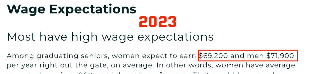 When I checked the previous report (which came from 2023 and not 2024), the numbers were much more reasonable. “[W]omen expect to earn $69,200 and men $71,900 per year right out the gate, on average,” the report states.