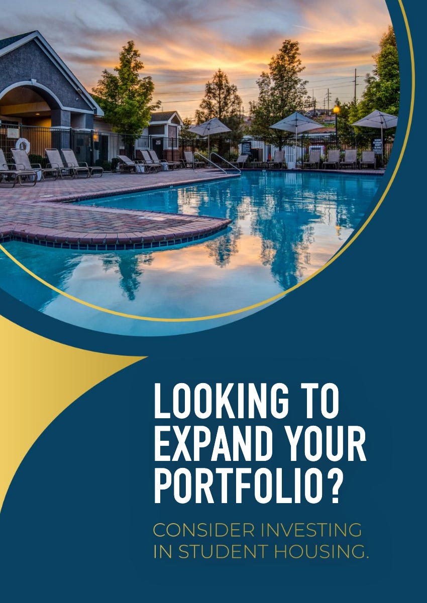 Every week, I see companies trading multimillion-dollar student housing real estate in college towns across the world like Pokémon cards. For instance, Campus Advantage promises investors huge returns on their student housing portfolio due to growth and unmet demand. They stated, “annual sales volume increasing over 200% in a five-year period from approximately $2.95 billion in rolling average in 2013-2014 to $6.12 billion rolling average in 2018-2019.”